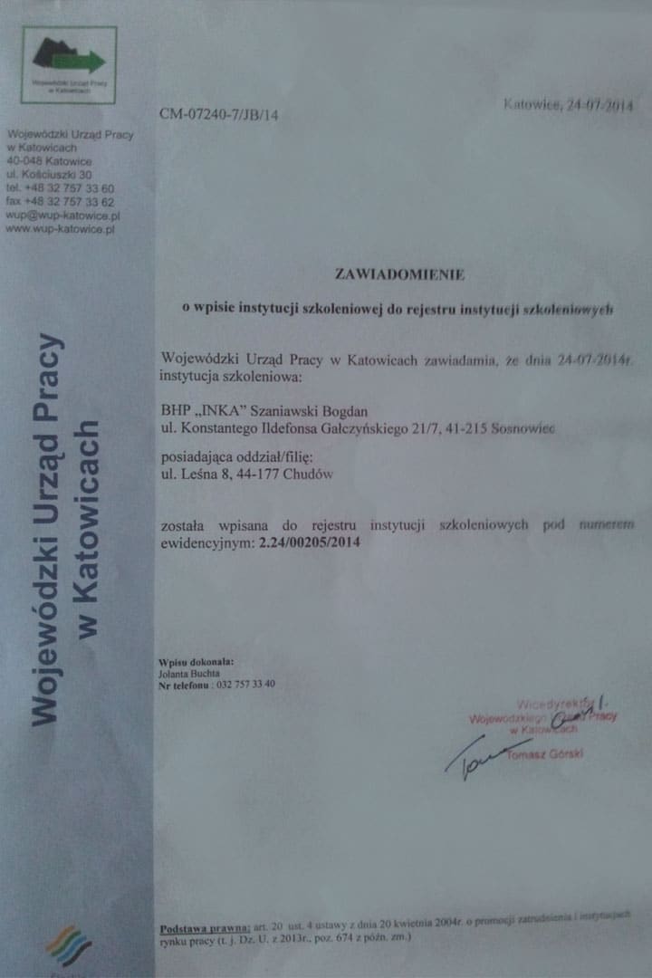 Wyróżniono nas min: za korzystanie ze środków audiowizualnych, które podnoszą jakość naszych szkoleń. Dla spółdzielni mieszkaniowej ,,Lokum’’ w roku 2014 w ramach szkoleń wstępnych BHP INKA przeprowadziła szkolenia w ramach szkoleń wstępnych 17 pracowników, zaś w zakresie szkoleń okresowych.