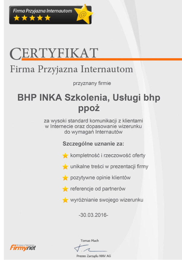 Firma BHP Inka uzyskała certyfikat ,,Firmy Przyjaznej Internautom’’. Wyróżnienie zostało przyznane za wysoki standard komunikacji z klientami w Internecie oraz dopasowanie wizerunku do wymagań internautów. Wyróżniono nas za: Kompletność i rzeczowość oferty, pozytywne opinie klientów, referencje i wyróżnianie swojego wizerunku.